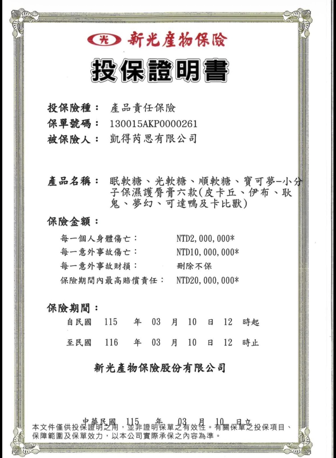 全站販售產品皆已投保新光產物保險兩千萬產品責任險
