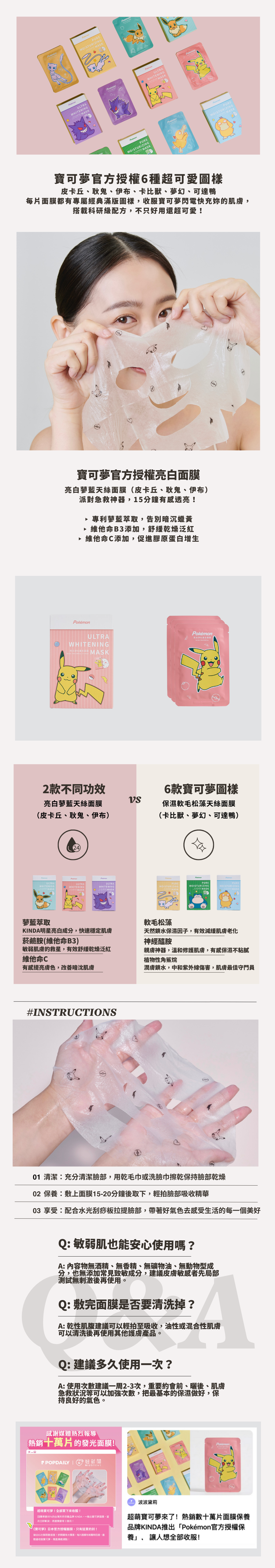 獨特技術會呼吸的布!讓渴望的毛孔能好好喝飽水。搭載專利蓼藍等亮白滲透配方,15分鐘緊密服貼,滿滿精華導入鎖住,讓皮卡丘閃電快充妳的肌膚。
