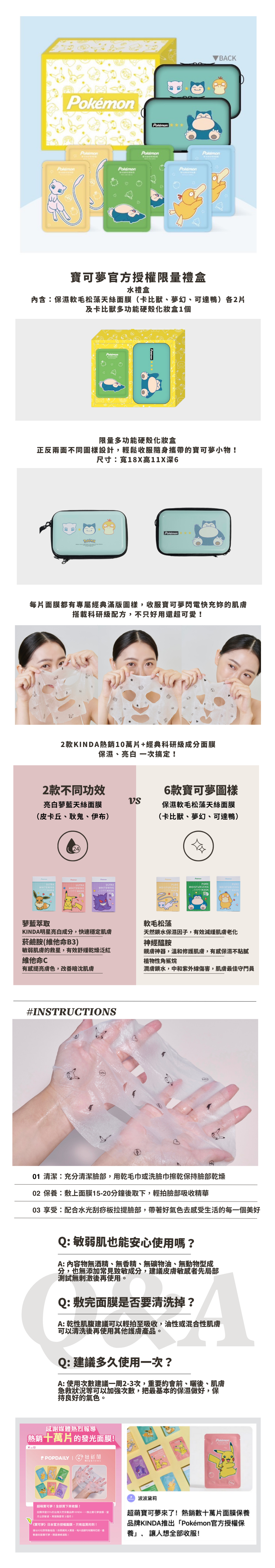 專為敏感肌設計,不只可愛,更要15分鐘有感保濕!肌膚嘴唇一起顧,讓滿版皮卡丘為妳補水充電。光滑天絲柔膚面膜布+小分子吸收玻尿酸,讓肌膚跟嘴唇瞬間亮、白、嫩。